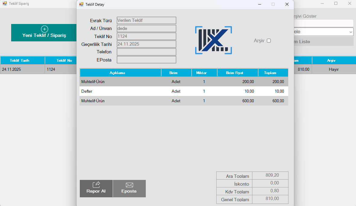 Sipariş listesi ve Teklif hazırlama, raporlama ve takibi