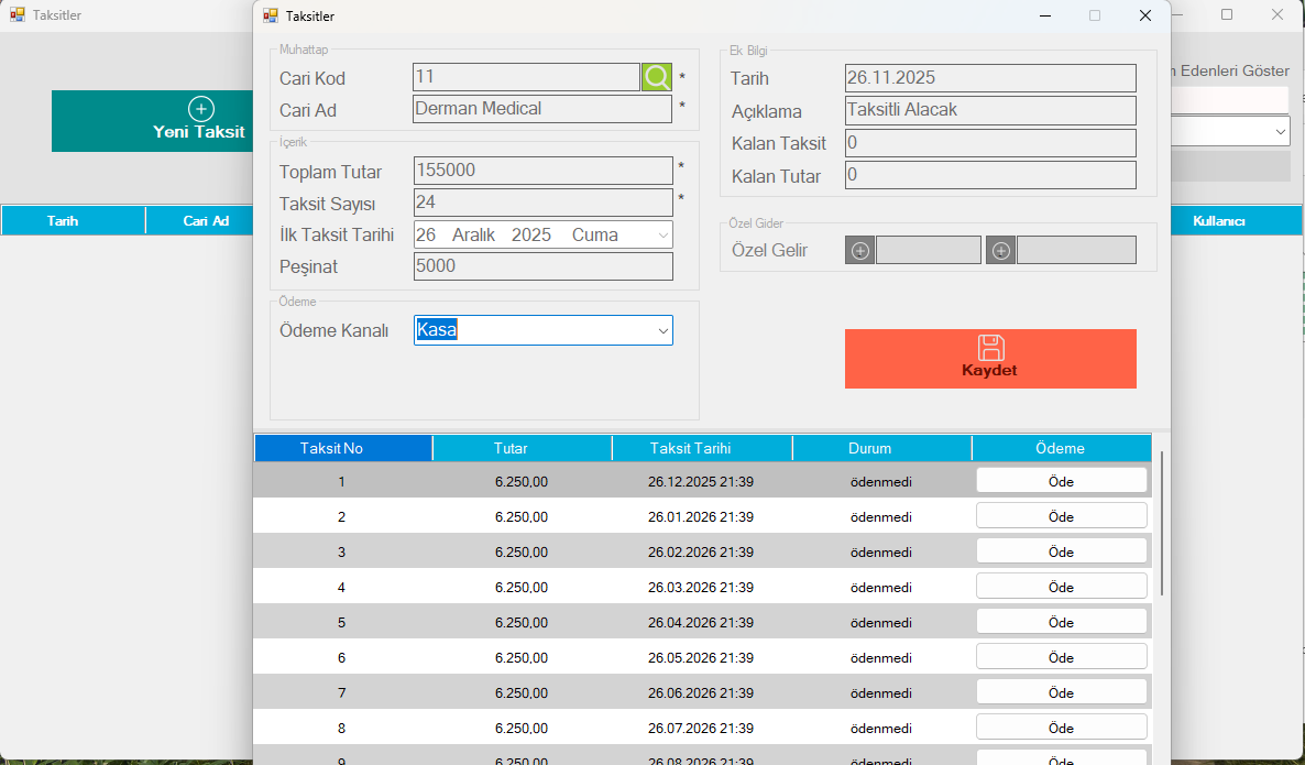 Taksitli borç alacaklar ve Krediler için taksit tablosu oluşturma, ödeme takibi ve raporlama