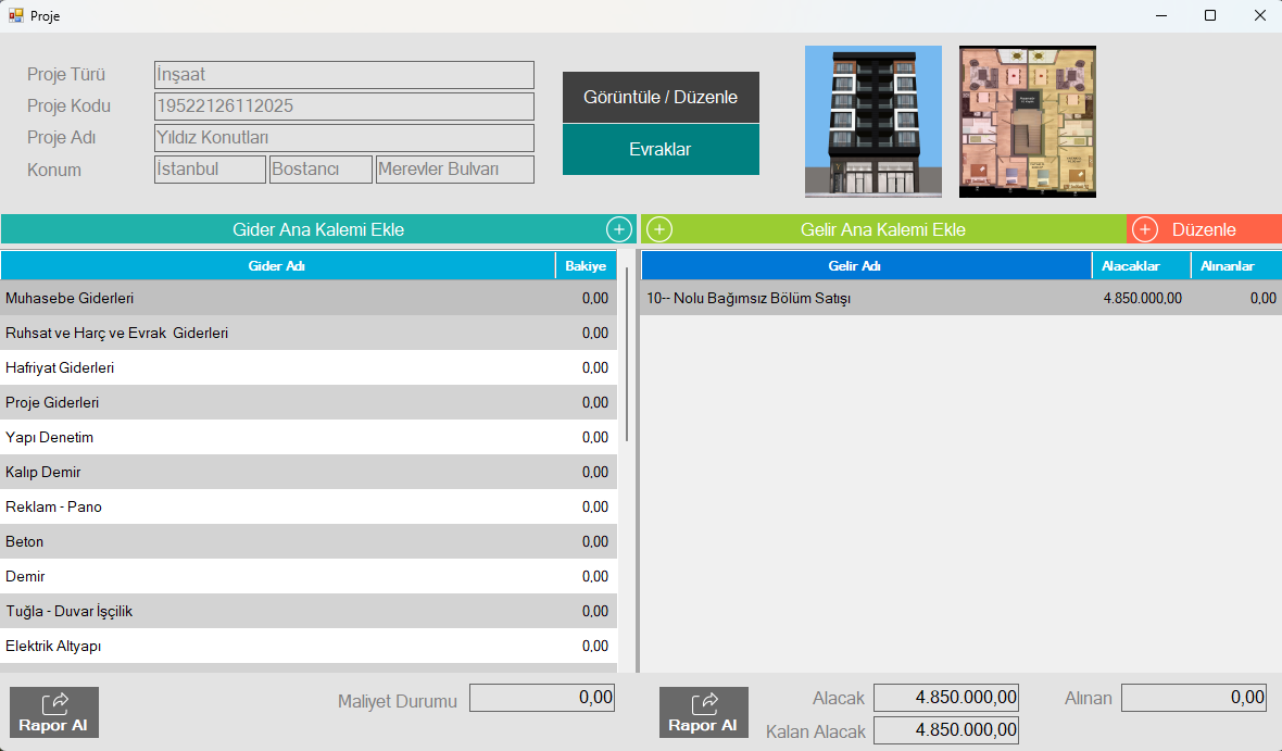 Alım-satım ve yapım gibi işlerin kar-zarar, maliyet, gelir gider ve evrak takibi