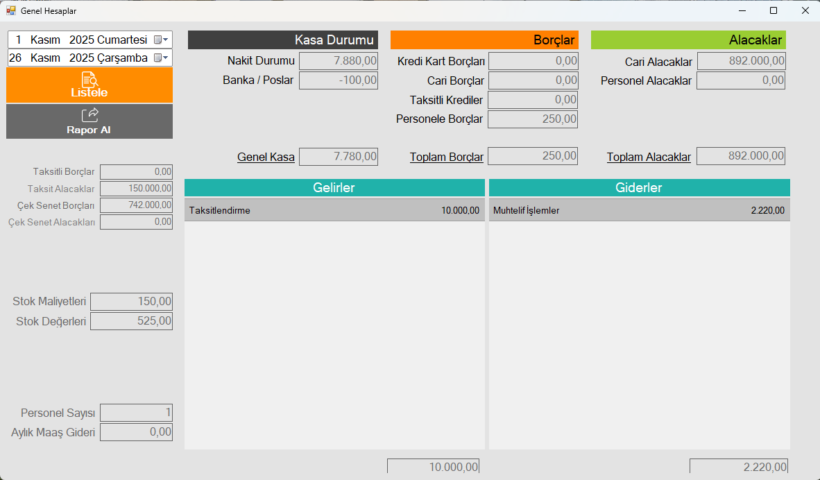 Günlük, haftalık, aylık, yıllık ayrıca tarihe göre borç ve alacak listesi oluşturma ve ödeme takibi