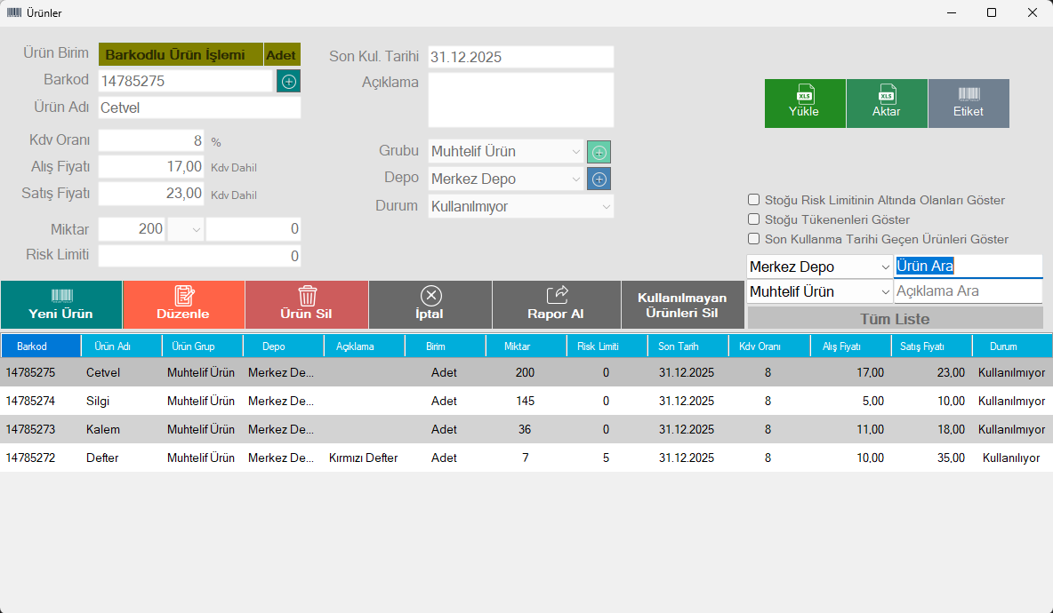 Ürün ekleme, silme, düzenleme, filtreleme ve raporlama, Etiket hazırlama, Excel den toplu ürün yükleme ve yedek alma, Ürün grubu ve depoları yönetme, Stok giriş çıkış izleme, kar-zarar hesabı ve alış satış istatistikleri.