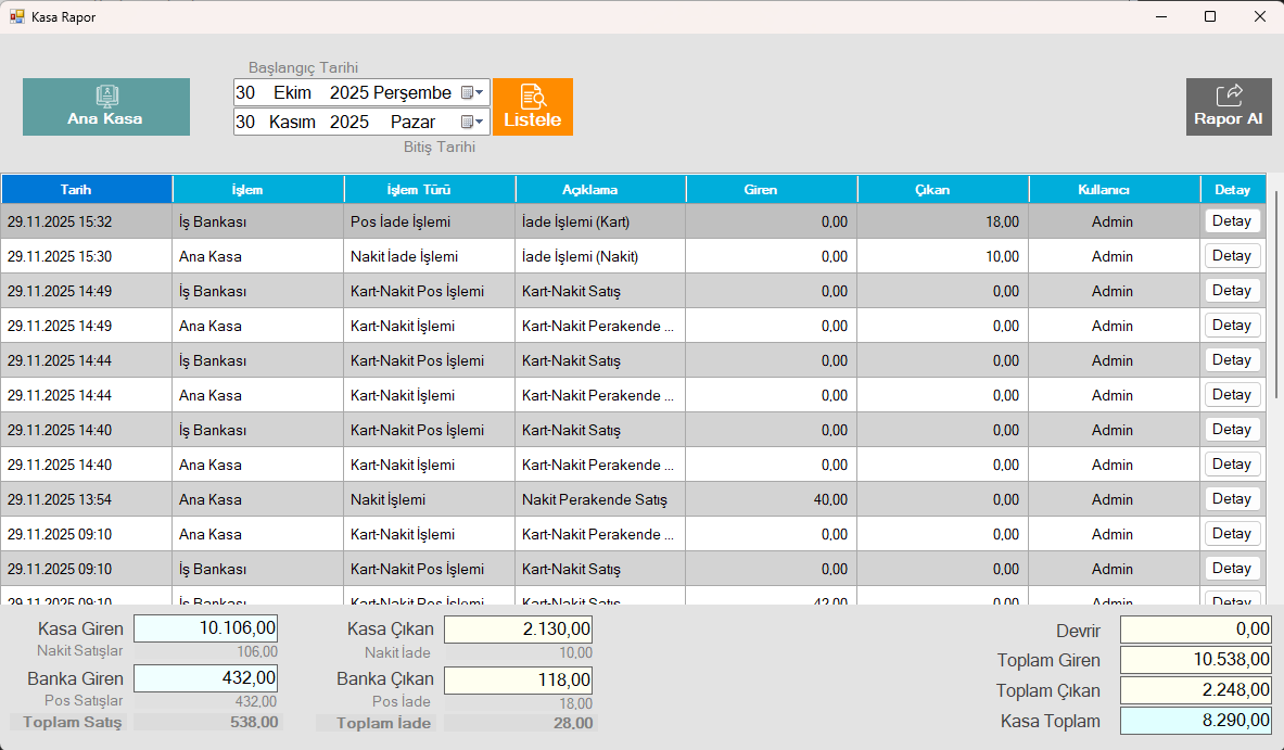 Kasa işlemlerinin kasa defteri ve liste formatında takibi ve raporlanması